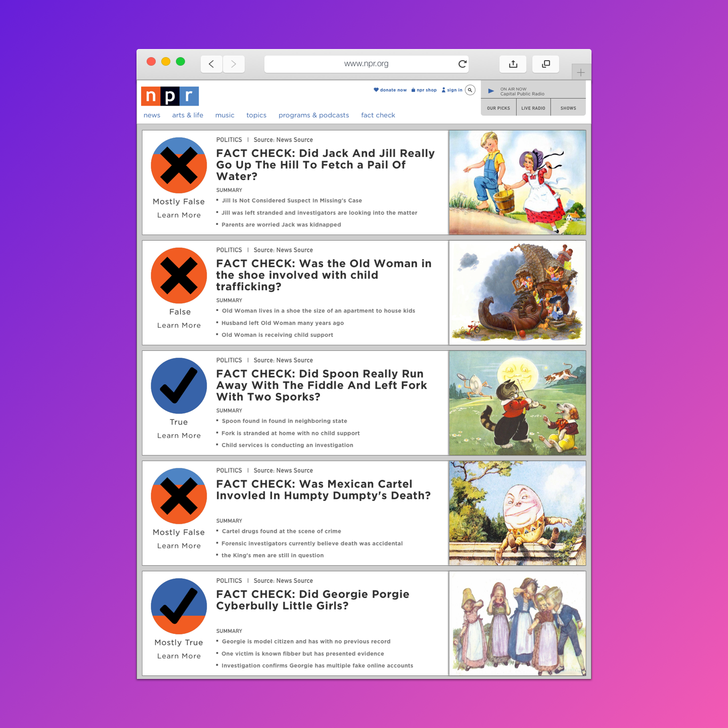 Design an NPR platform that makes it easy for users to identify and edcuate themselves about fake news topics.